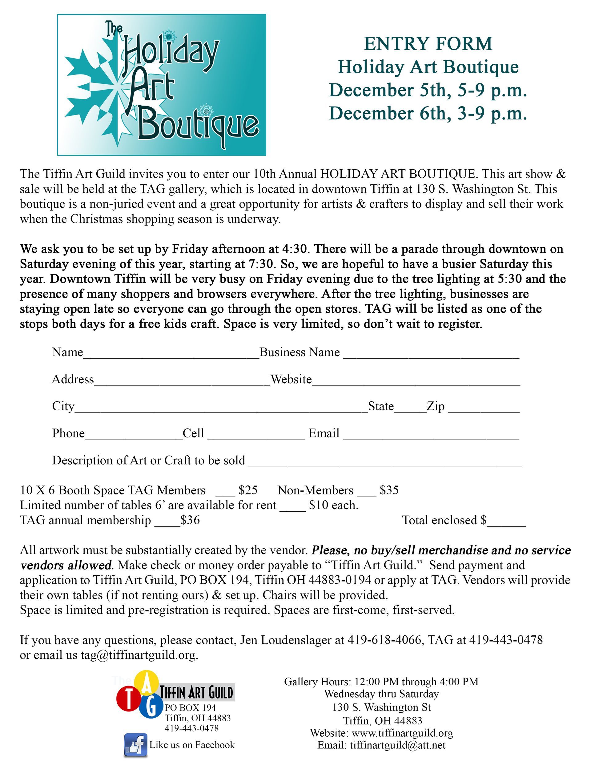 There are 6 spots left for vendors for the Holiday Boutique. Sign up now before they are gone! Bring or mail the completed form to Tiffin Art Guild, 130 S. Washington St., Tiffin OH 44883. You can also call Jennifer Loudenslager to register by phone at 419-618-4066.